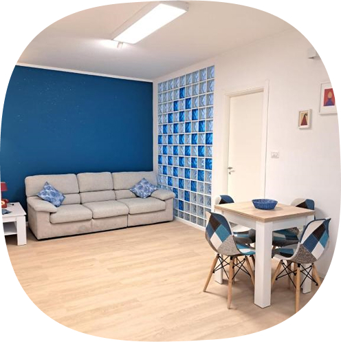 Ambienti moderni, colori che richiamano il mare e il Vesuvio.